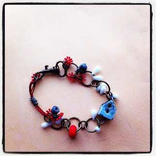 And, just for kicks, here's another little piece I made the other day with a lovely little house from Elukka who makes the most charming ceramic houses, owls and other adorable goodness. That lovely red matt glass bead is from Veda's Beads and there's lot of other goodies involved including My Elements Pixies, some Indonesian Glass, some dyed coral (I think) and red leather. After I made this piece, I decided this was a little boat house on the ocean and I wanted to go there immediately.